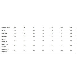 * Las medidas son orientativas y pueden variar en unos pocos cm. Las medidas de pecho, cintura y cadera indicadas en la imagen corresponden a los cm. de la prenda sobre una superficie plana, para determinar el contorno aproximado se debería multiplicar la medida x2.